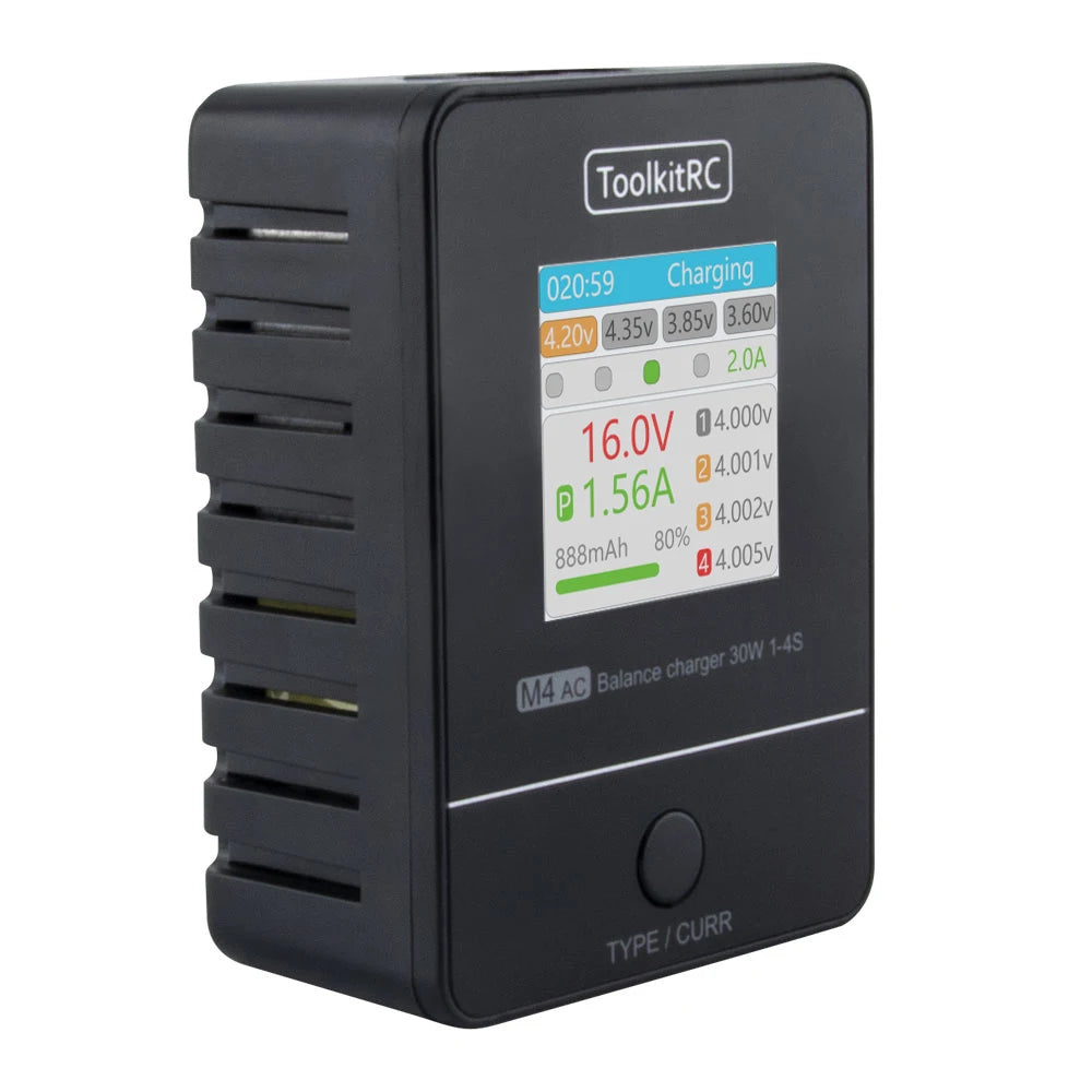 ToolkitRC M4AC 30W LiPO LiFE LiHV Compact AC Charger 1-4S XT30/ XT60 Interface for RC Model FPV Racing Freestyle Drone Batteries